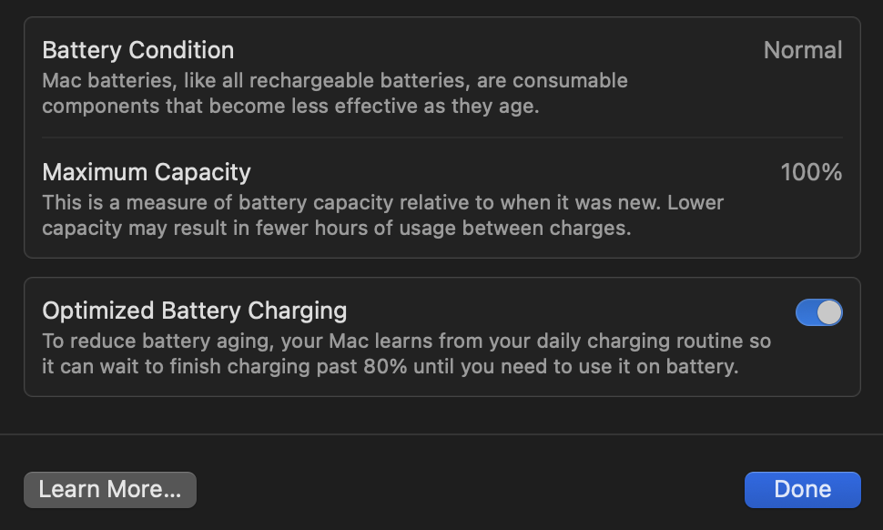 When I look at my battery health, it’s still at 100% after more than a year later. I plan on checking this against some of my other ARM based Windows laptops for comparison, but this is great to see that my battery is still super healthy.