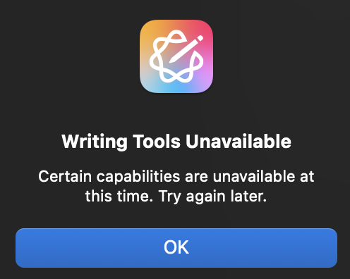As an example, one of the benefits is Writing Tools. It’s a great alternative to Copilot and across the Apple ecosystem its sprinkled in your applications in a very nice and subtle way. Still sometimes I’m met with inconsistencies. I’ve used Writing Tools in one application and I get met with the following error: